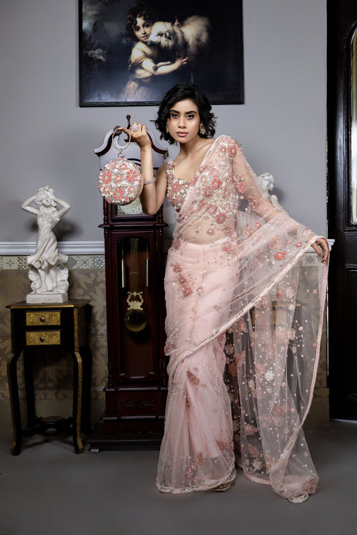 Blush pink floral embroidered ensemble Saree