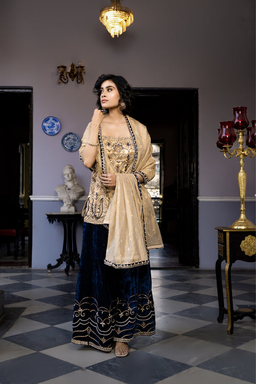 Elegant gold kurta with navy sharara and embroidered dupatta